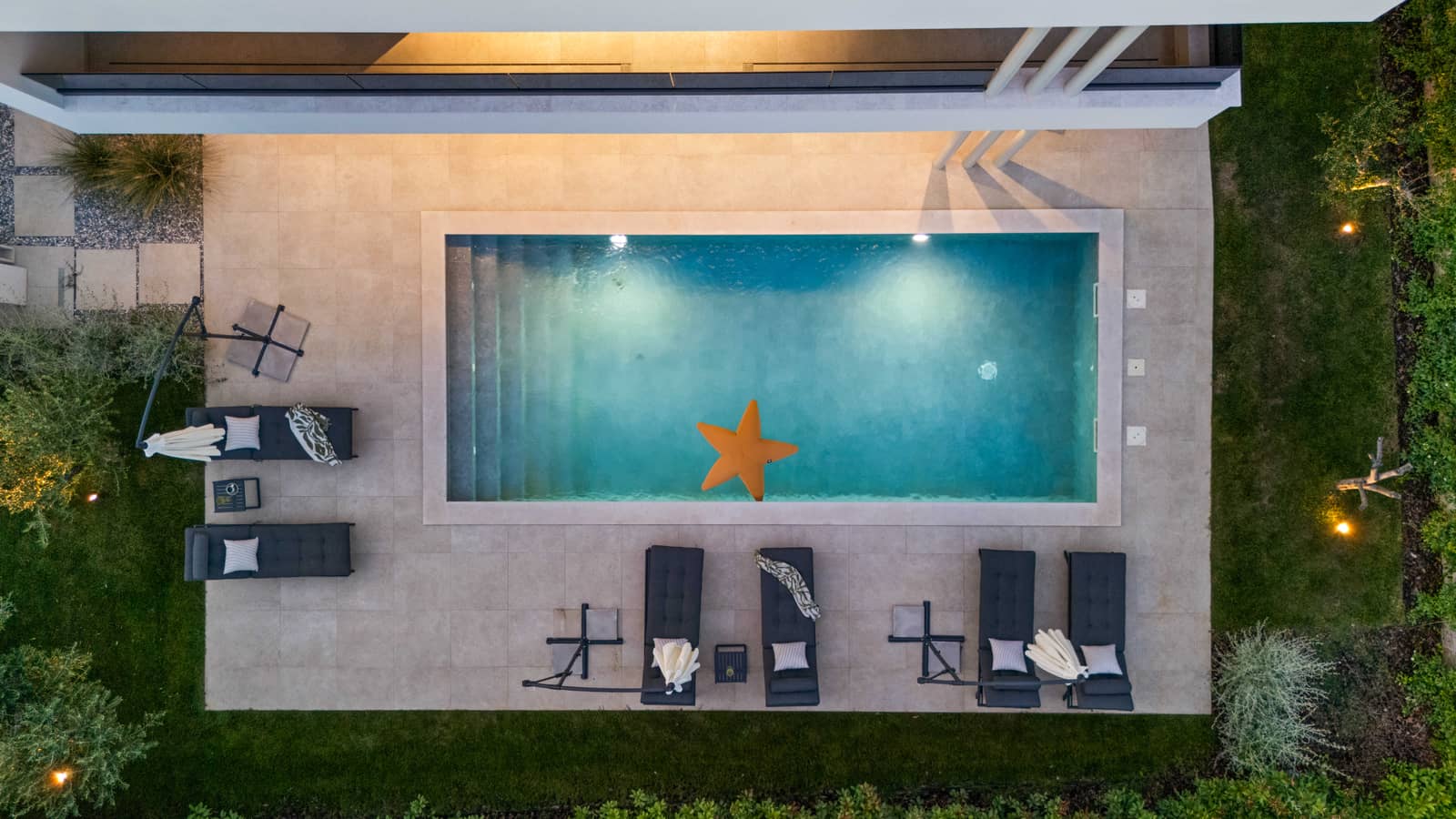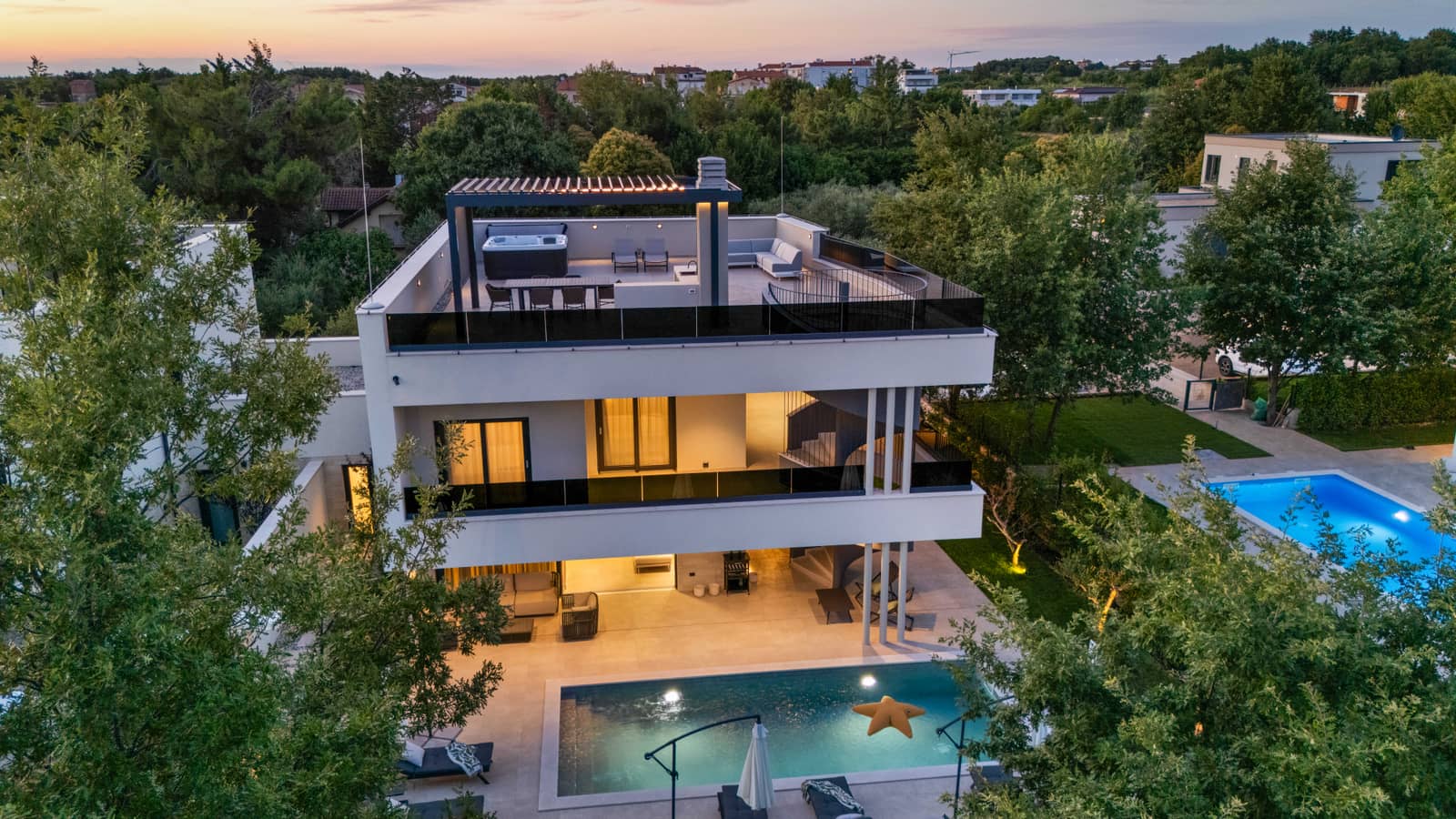 Enjoy relaxing moments in the sauna, jacuzzi or cooling off in the private pool, while the evening is ideal for gathering on the spectacular roof terrace - one of the most beautiful in the region - with a glass of wine and a view of the starry sky. There is also an outdoor kitchen with barbecue, perfect for preparing summer delicacies.